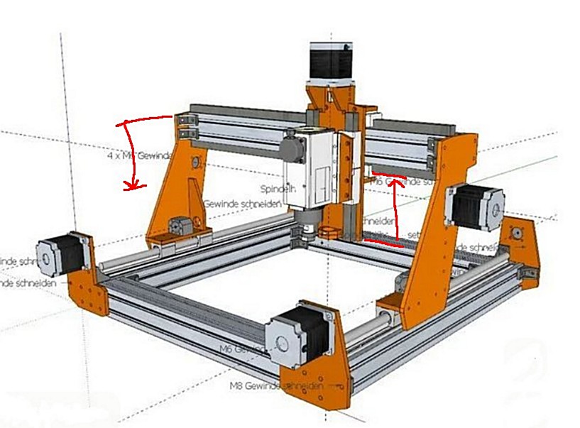 Wat ook vaak fout gaat, is de lengte van de Z-as. ( en ik kan het weten, ik heb mijn Z-as al 3x verbouwd :-) ) Ik probeer het uit te leggen met behulp van het bovenstaande plaatje, ik heb er wat hulplijnen op getekend om het duidelijk te maken.